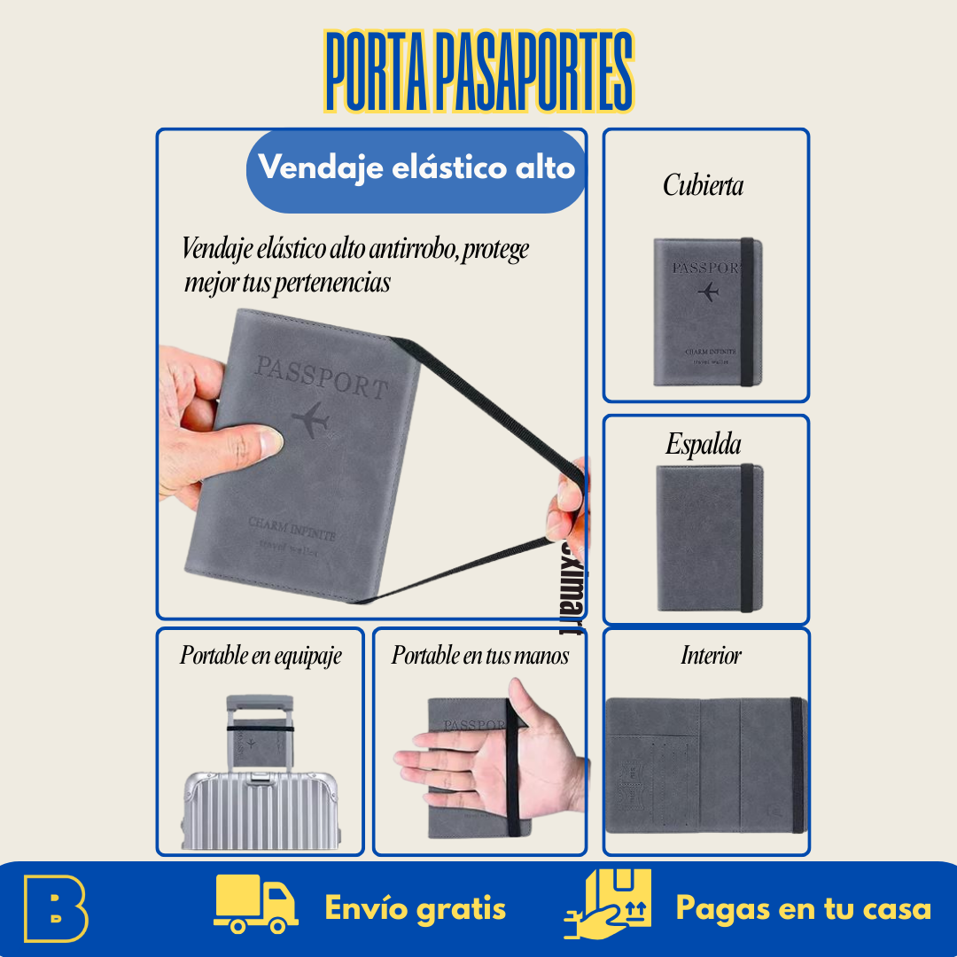 Diseño tipo billetera: pasaporte a la derecha y tarjetas/tiquetes/efectivo a la izquierda para que todo tenga su espacio.